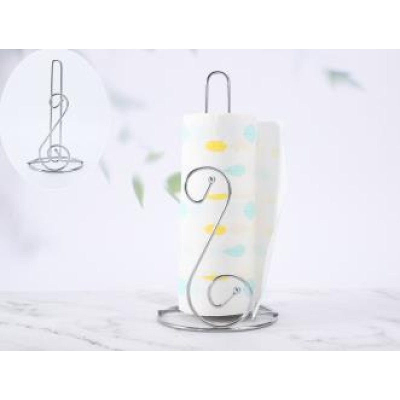 This is a silver-toned, freestanding paper towel holder, likely made of stainless steel or chrome-plated metal.