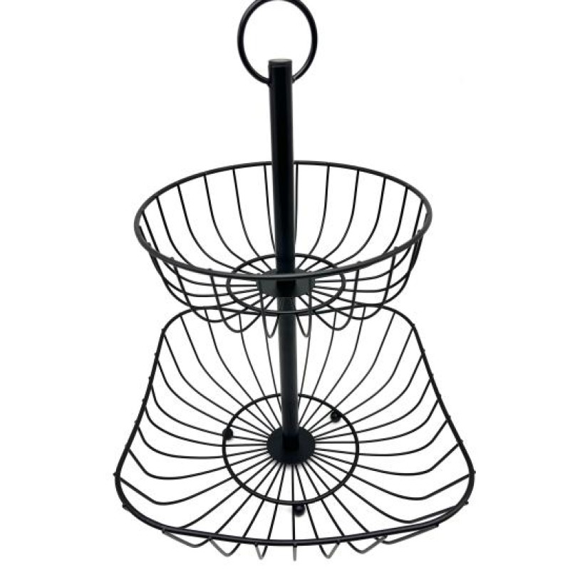 two-tier metal fruit basket. This item is designed to hold multiple items while taking up minimal counter or table space.
