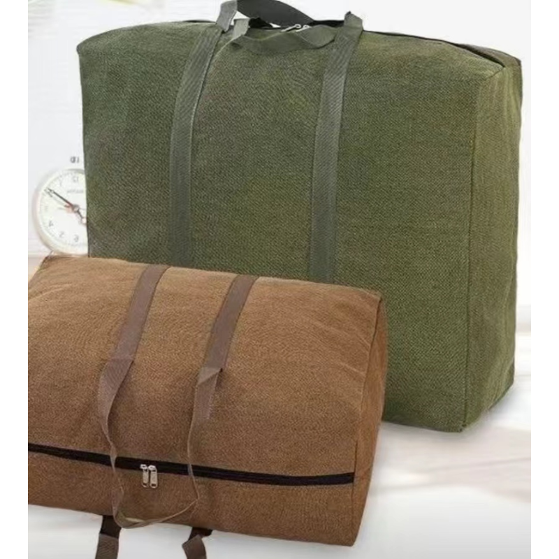 large canvas travel or duffel bags, available in olive green and brown colors.