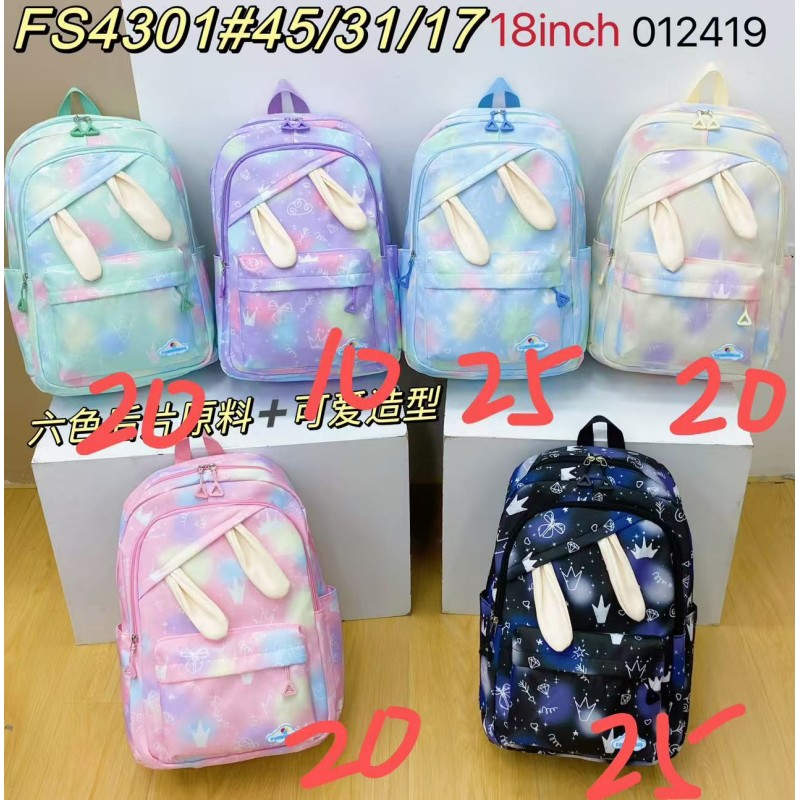 collection of tie-dye and patterned backpacks with bunny ears and varying price points.
