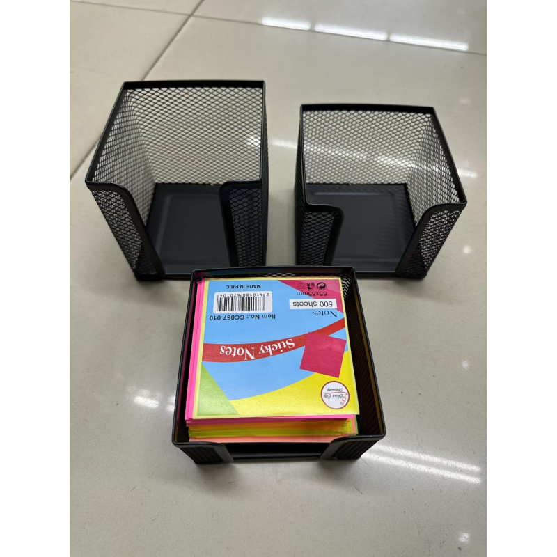 black mesh metal desk organizer set with sticky notes.