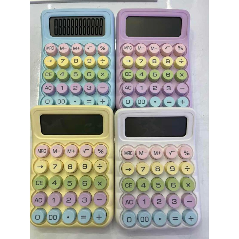 set of four portable mechanical keyboard calculators in assorted pastel colors.