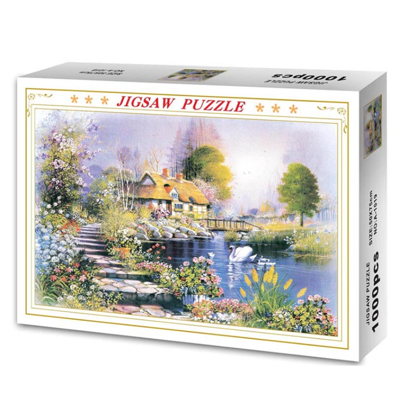 1000-piece jigsaw puzzle featuring a scenic countryside cottage and swan pond image.