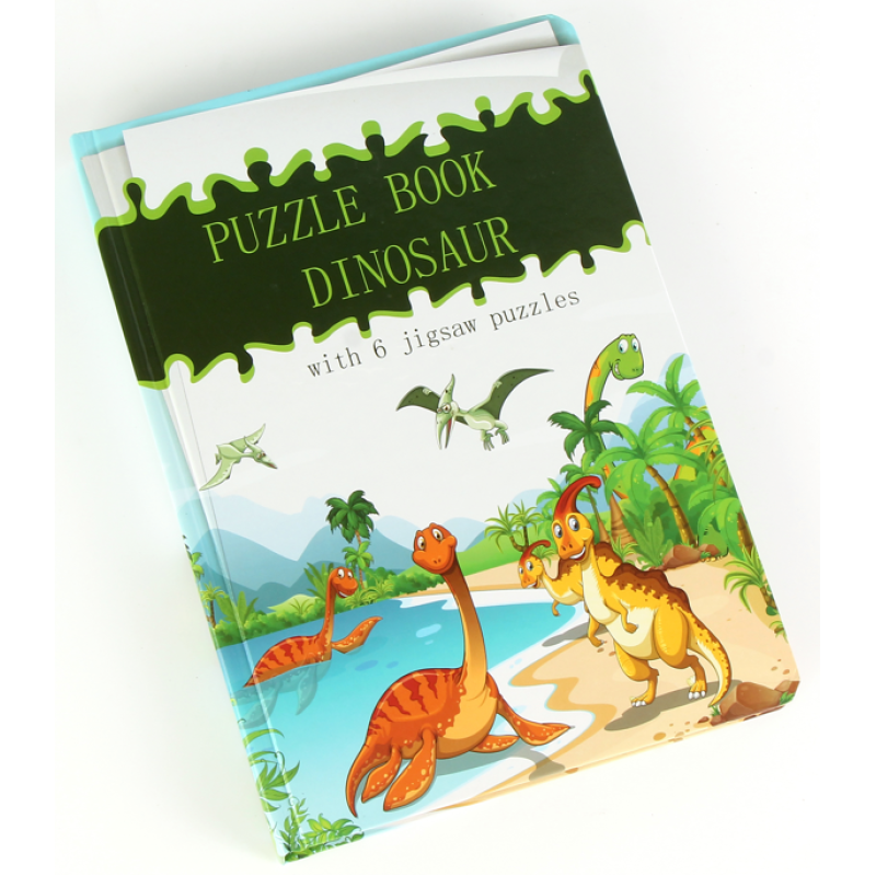 It is a dinosaur-themed storybook that includes six removable jigsaw puzzles.