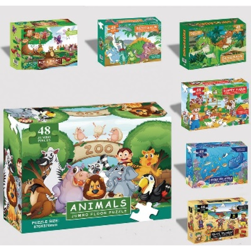 Jumbo floor puzzles for children, with a prominent focus on an "Animals Jumbo Floor Puzzle". These products are designed for playful learning and developing fine-motor skills.