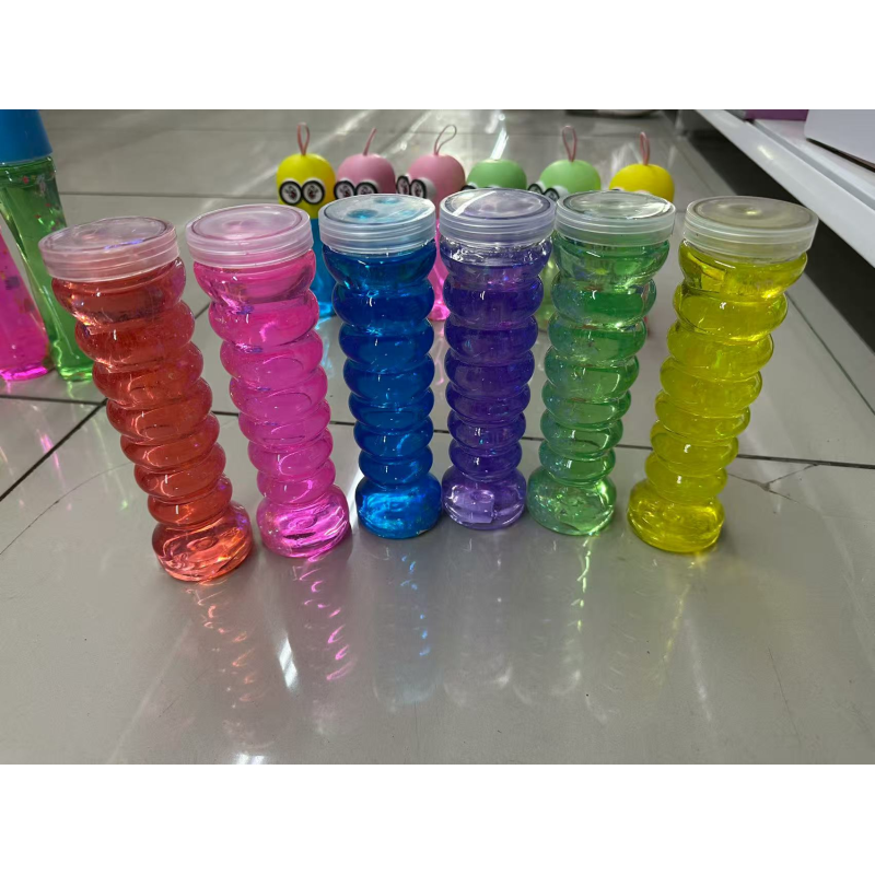 The clear containers showcase gradient colors and contain a foam ball inside.