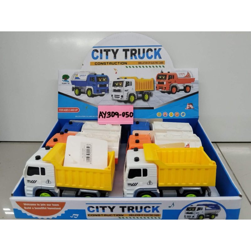 box of "City Truck Construction" friction toy trucks, likely sold in a two-pack set.