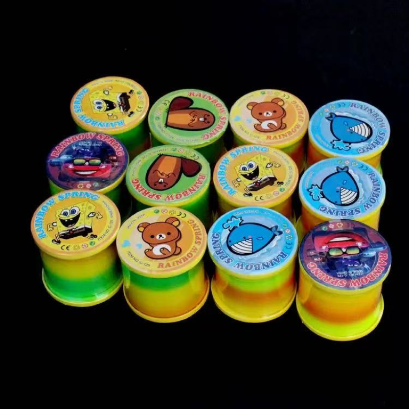 rainbow-colored plastic slinky springs, a classic novelty toy. These toys are known for their ability to stretch, bounce, and "walk" down stairs.