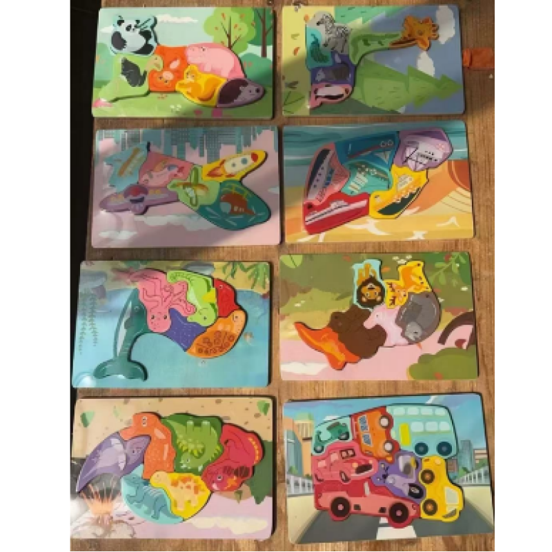 The set includes multiple individual puzzles featuring animals and vehicles.