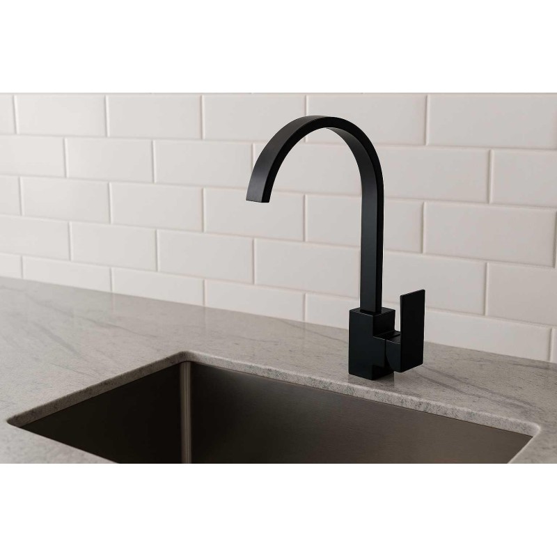 The matte black finish adds a contemporary touch that complements modern sinks and countertops, while the square design with a high-arc spout provides plenty of clearance for washing dishes or filling large pots. The single-lever handle allows smooth control of water temperature and flow, making everyday kitchen use easy and efficient.