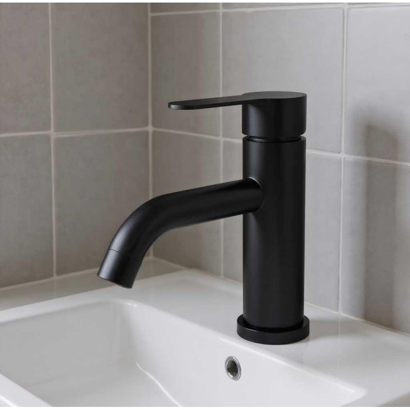 The matte black finish provides a sleek, contemporary look that pairs perfectly with both white ceramic and stone basins. The single-lever handle allows precise control over water temperature and flow, while the ceramic cartridge ensures smooth operation and a drip-free seal.