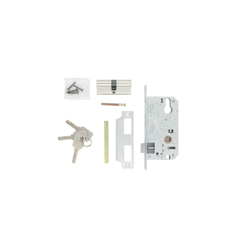 Complete Door Lock Kit includes mortice lock body, euro cylinder, 3 keys, handles, spindle, strike plate, and screws.