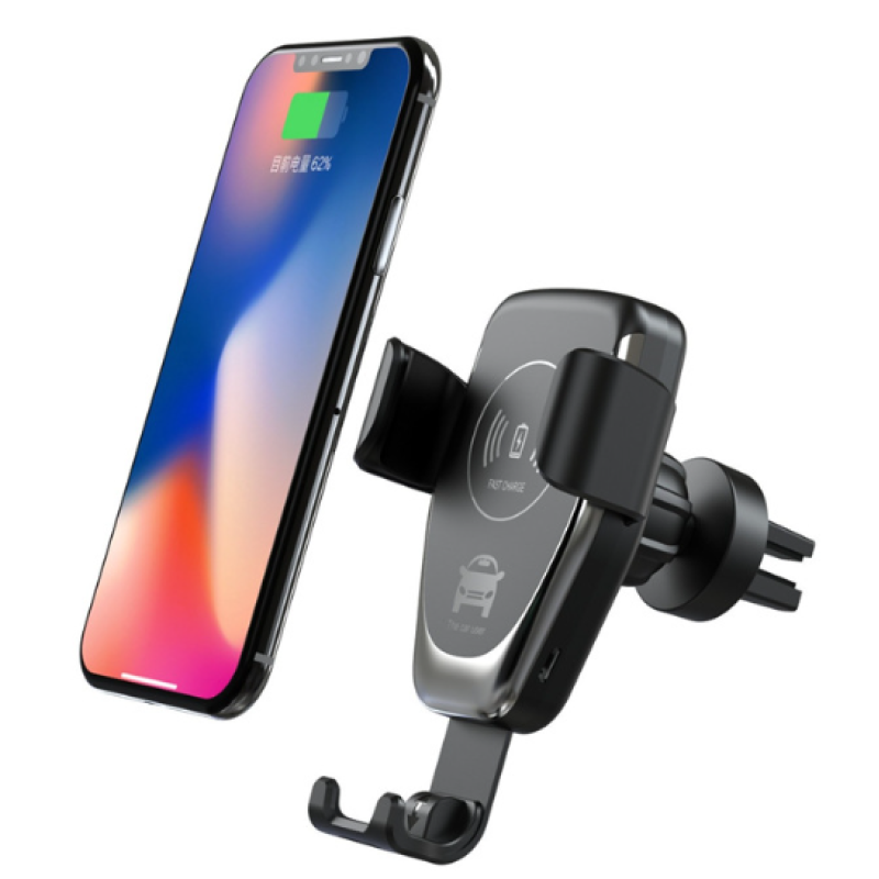 wireless car mount charger with automatic clamping and a vent clip attachment.