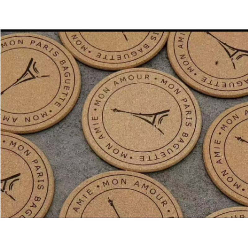 Round cork coasters with text and a graphic of the Eiffel Tower. The text is in French and English, repeating phrases like "Mon Paris", "Mon Amour", "Mon Amie", and "Baguette".