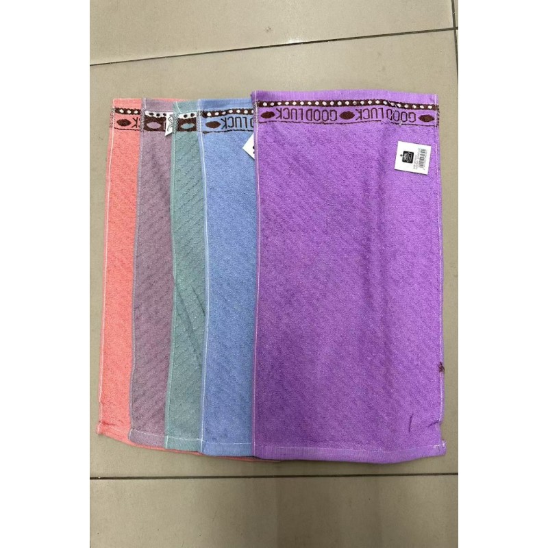 The towels in the image feature a decorative border with the words "GOOD LUCK" repeated along the edge.