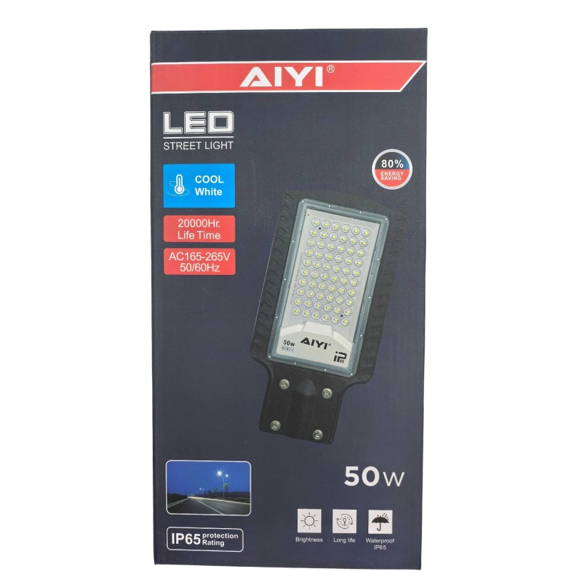 The AIYI 50 W LED Street Flood Light combines slim design and powerful output, making it ideal for driveways, parking areas, walkways, signage, or security lighting. With 60 high-efficiency LEDs, it provides a bright, uniform cool white 6500 K light (CRI 80) for clear visibility.
