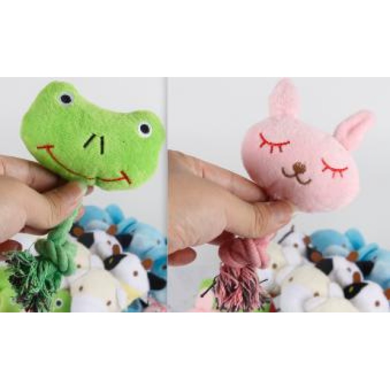 The toys feature cartoon animal designs, specifically a green frog and a pink rabbit, with a rope attachment for interactive play.