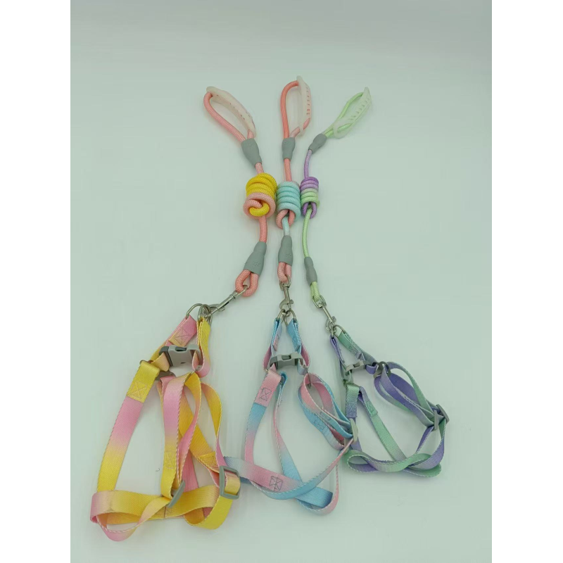dog harness and lead sets with a vibrant, tie-dye color scheme.