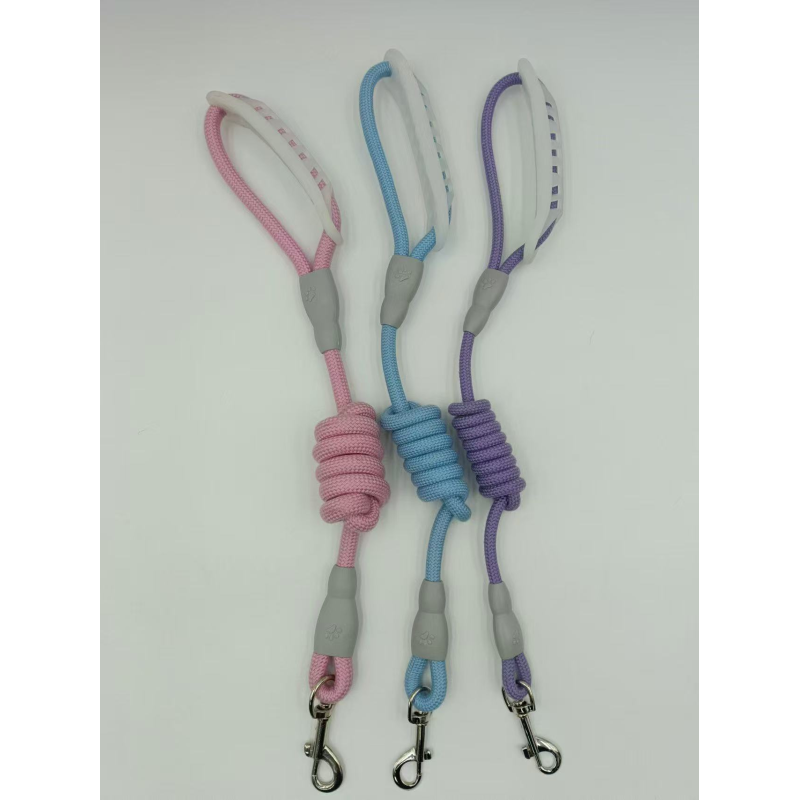 The leashes in the image are made from a braided rope material with a hand loop on one end and a metal clip (carabiner) for attachment to a collar or harness on the other.
