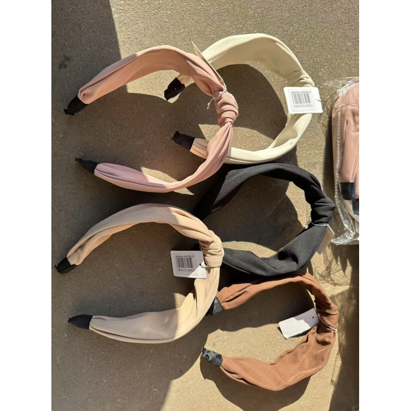 collection of knotted fabric headbands in various neutral colors.