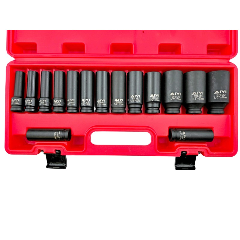 15 deep impact sockets: 10mm, 12mm, 13mm, 14mm, 15mm, 16mm, 17mm, 18mm, 19mm, 21mm, 22mm, 24mm, 27mm, 30mm, 32mm.